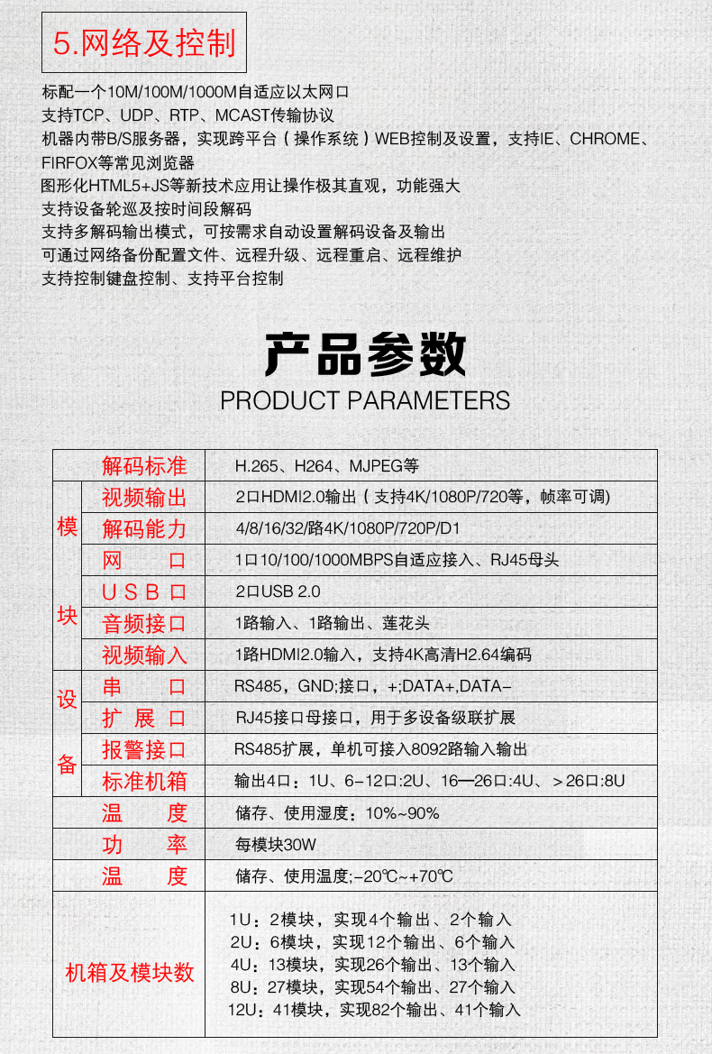 網(wǎng)絡(luò)數(shù)字解碼矩陣切換器采用最新的安防專用編解碼芯片,專為H.265標準及4K超高清編解碼而設(shè)計,產(chǎn)品采用嵌入式LINUX架構(gòu),保障系統(tǒng)的穩(wěn)定運行,采用模塊化設(shè)計,可以在大型、超大型數(shù)字安防監(jiān)控系統(tǒng)中實現(xiàn)解碼、編碼、拼接、分割、畫中畫、漫游等功能,為工程項目最大程序解決大數(shù)據(jù)數(shù)字化監(jiān)控系統(tǒng)提供解碼上墻及多信號輸入編碼等提供一站式解決方案;設(shè)備采用全鋁標準機箱,結(jié)構(gòu)上大氣美觀可靠,散熱性結(jié)構(gòu)化好。